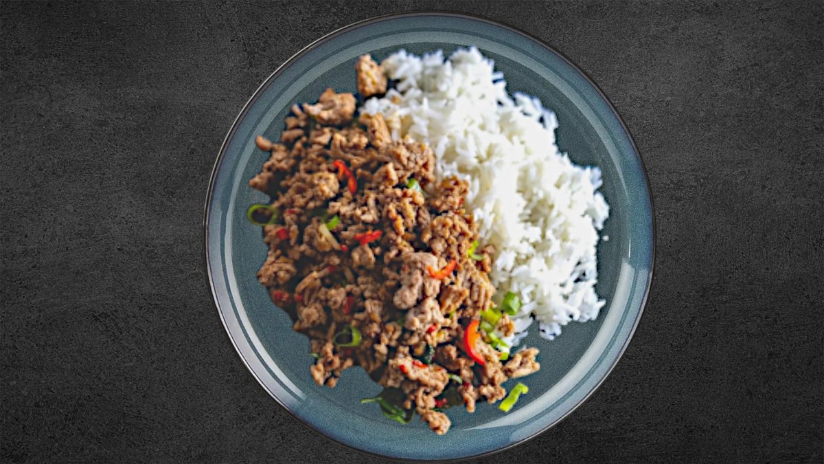 Woket kjøttdeig med frisk chili, hvitløk, grønnsaker og holy basil.