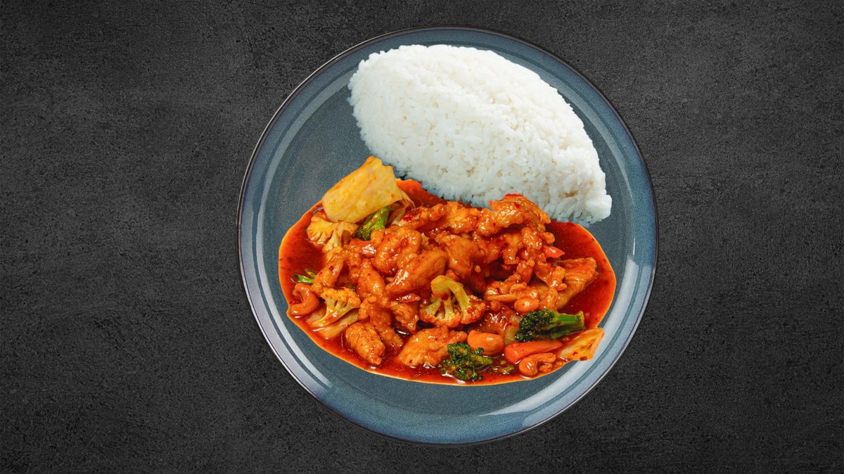 Wokstekt kylling med cashewnøtter, friske grønnsaker og en lett søt chilisaus.