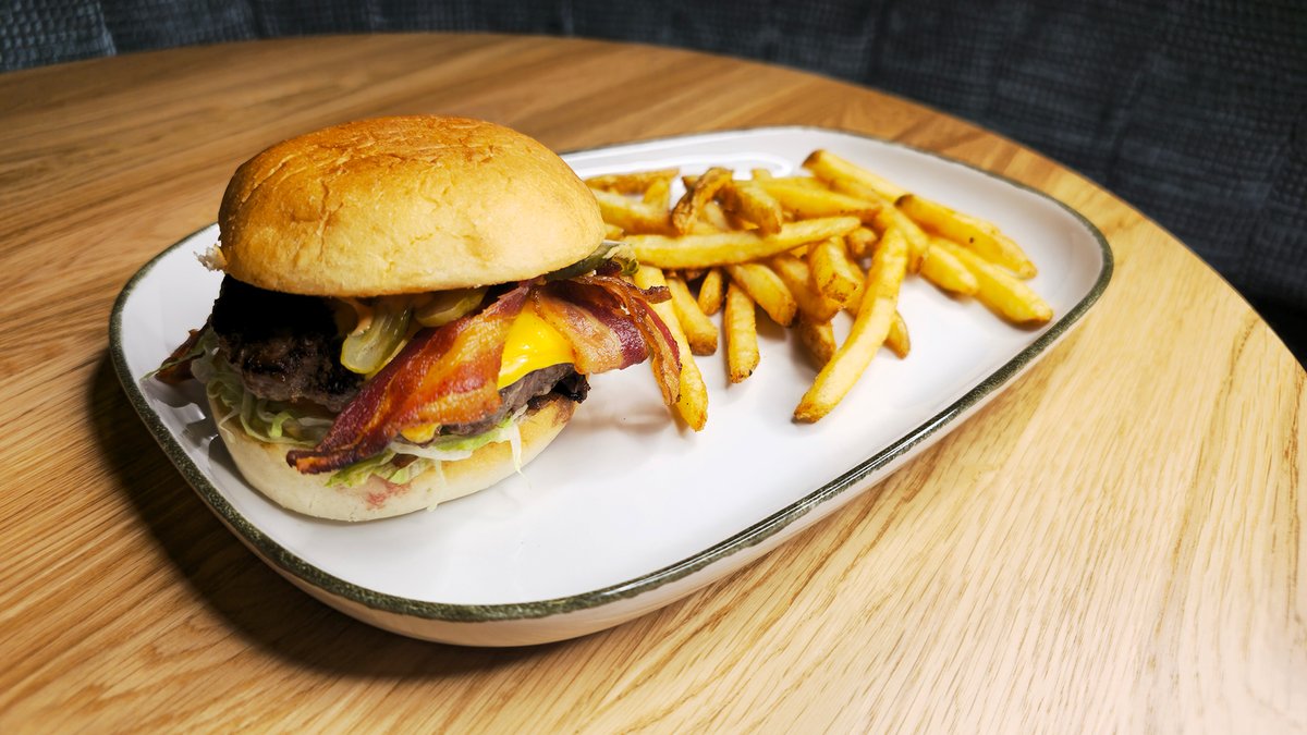 160g beef patty, American cheese, bacon, iceberg lettuce, tomato, pickles, Epic burger sauce, served on a potato bun. Allergens - gluten / egg / milk / mustard / sulphites