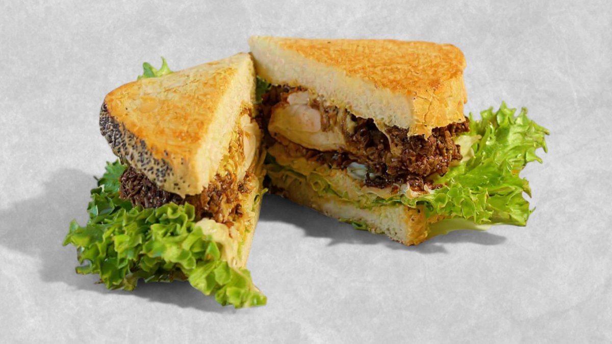 Kylling, salat, hvitkålsalat, ranch dressing og brød.