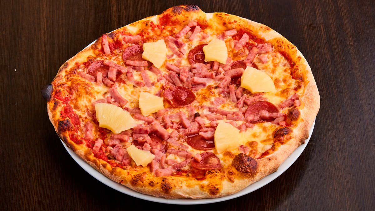 Ost, marinert kylling, ananas, paprika, rædlæk og bacon.