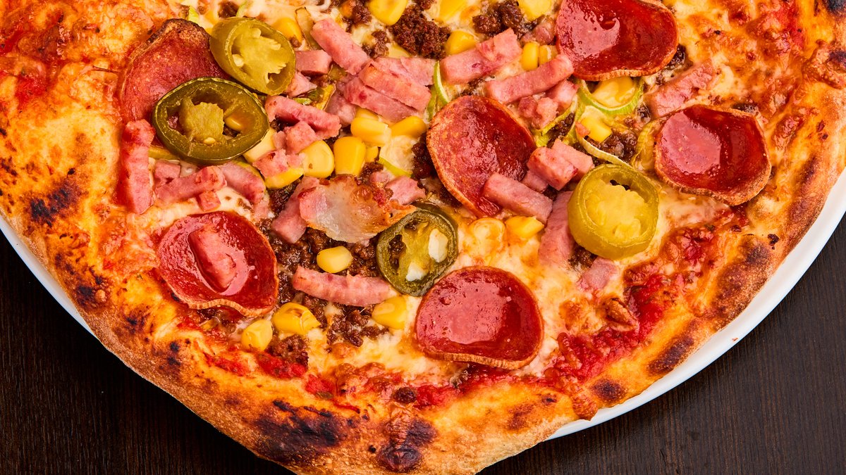 Ost, skinke, pepperoni, mais, paprika, jalapenos og bacon Allergener: ost, melk, soya og hvete