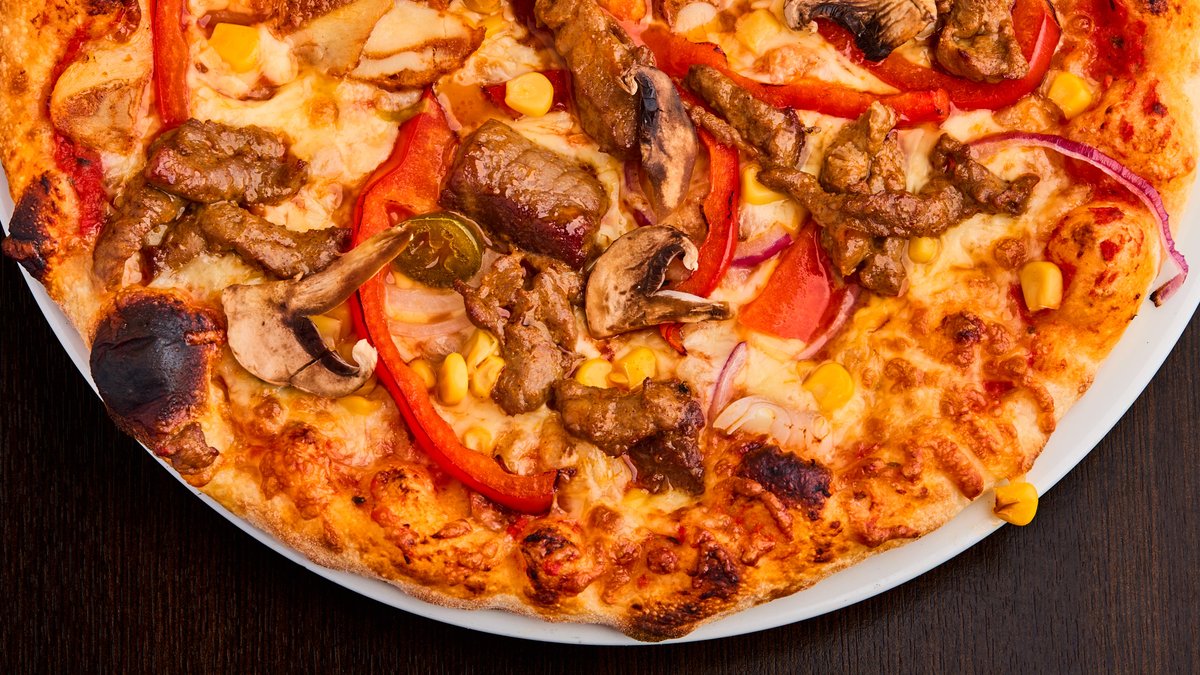 Ost, strimlet marinert biff, sopp, løk og mais.