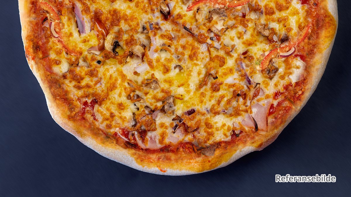 Ost og tomatsaus, skinke, chmpignon. Allergener: ost, melk, soya og hvete