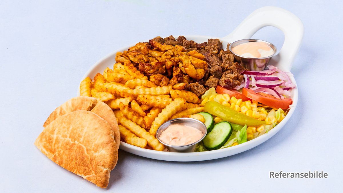 100g kylling og kebabkjøtt, pitabrød, kinakål, tomat, agurk, løk, hvitløksdressing pommes frites og 0,33l brus.