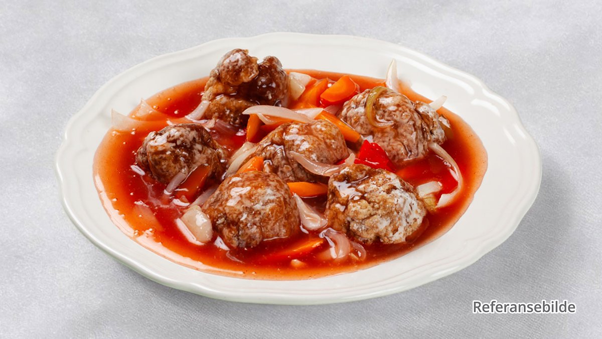 Innbakt svinekjøtt, kylling eller and med ananas, løk, agurk og paprika i sur-søt saus