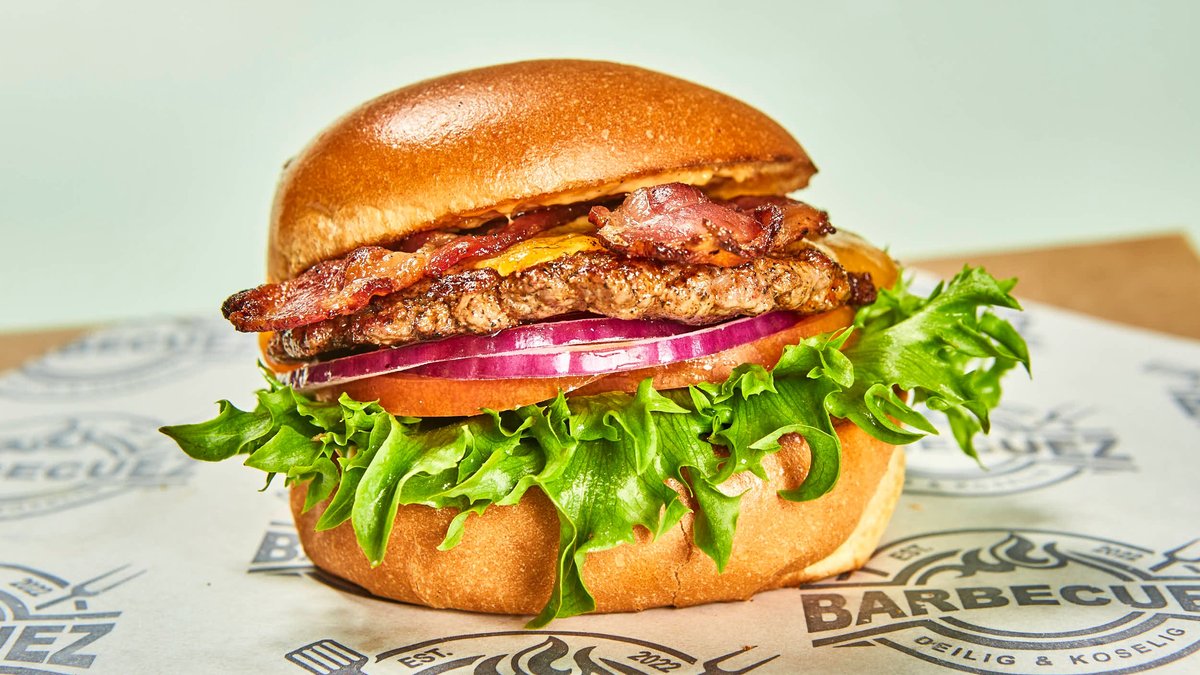 Burger dressing, biff patty, cheddar, bacon, crispy salat, tomat, rødløk