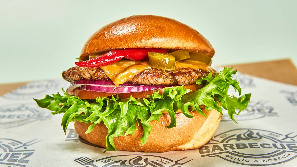 Buffalo dressing, biff patty, crispy salat, tomat, rødløk, cheddar, Jalapeno, chilipepper