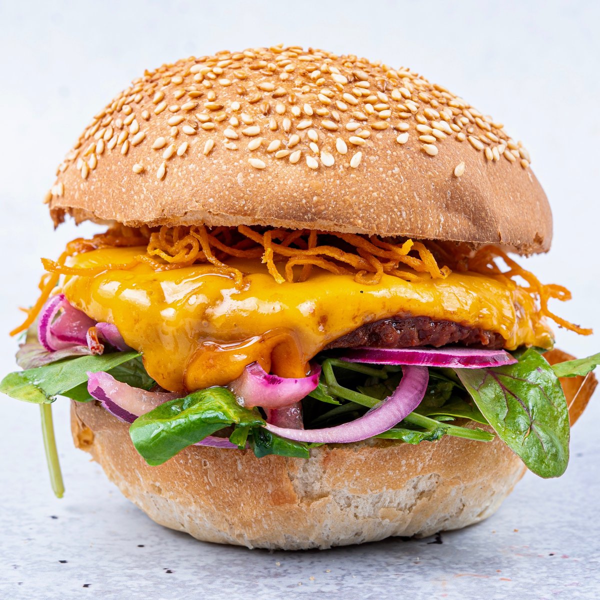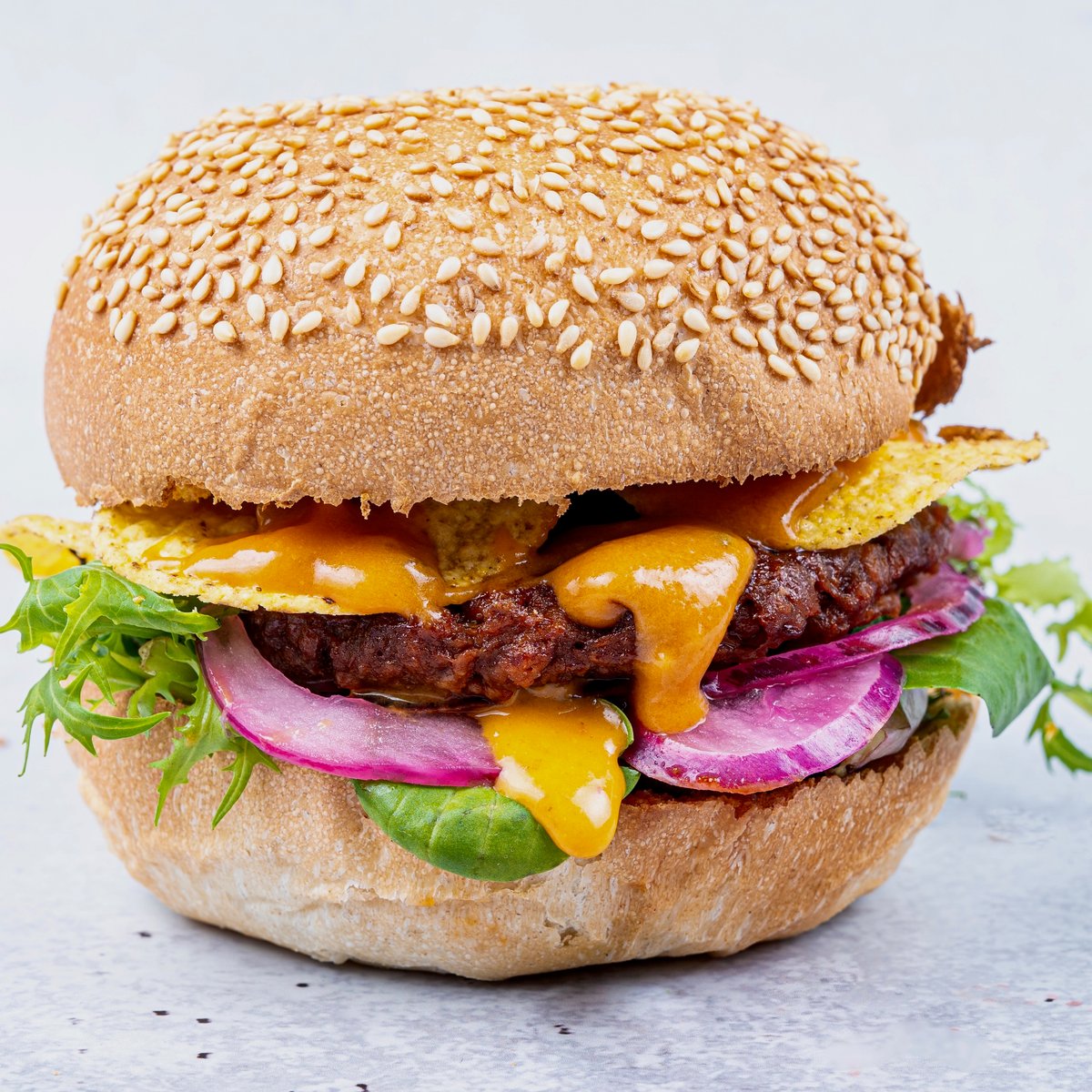 Patti av nordisk erteprotein, Hagens burgerdressing, Hagens salat, planteost, sprøstekt løk, syltet og karamelisert rødløk.