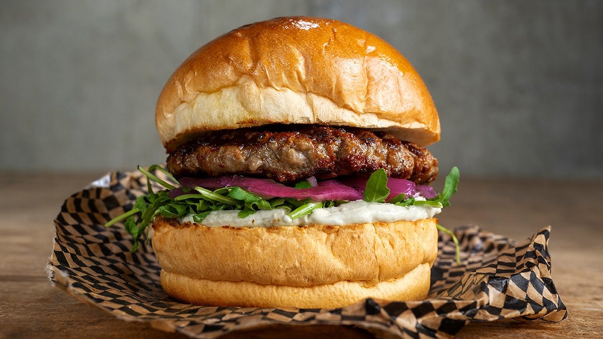 130g storfeburger med syltet rødløk, ruccola og blåostkrem.