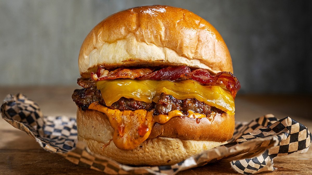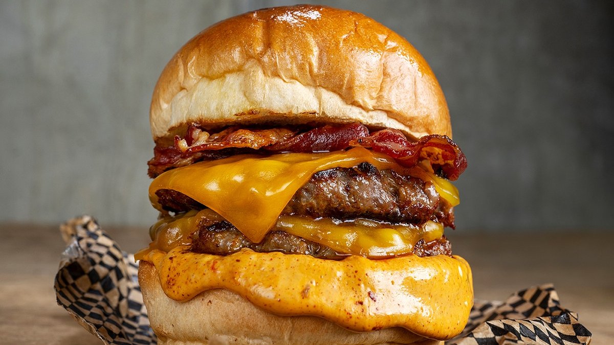 2 x 130 g storfeburger med kompisdressing, bacon og cheddar-ost.