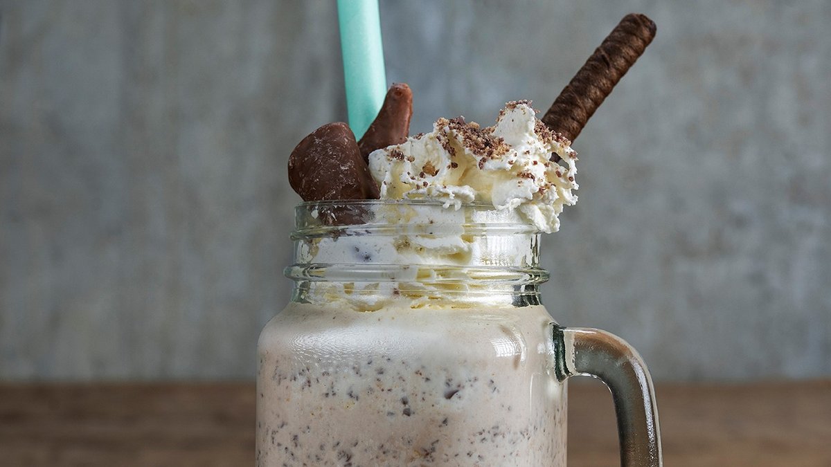 Smashshake toppet med krem, sjokoladekjeks, smash crunch og sjokoladesaus