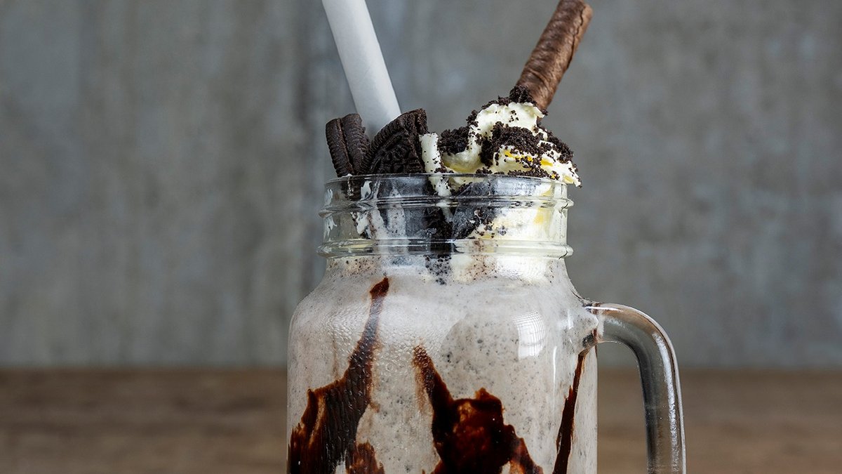 Oreoshake toppet med krem, sjokoladekjeks, oreostrø og oreokjeks.