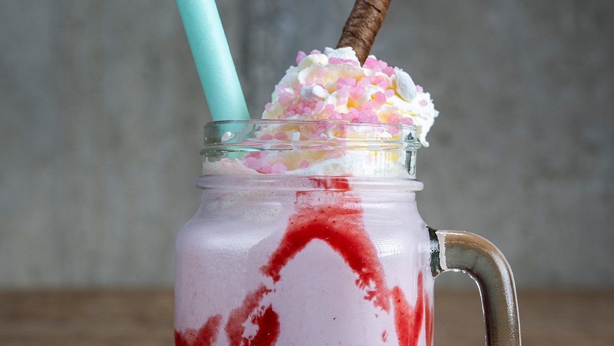 Jordbærshake toppet med krem, sjokoladekjeks, jordbærstrø og mini-marshmallows.