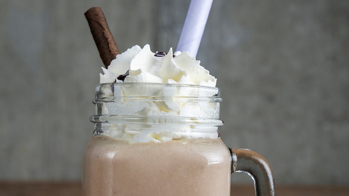 Cappuccinoshake. Toppet med krem, sjokoladekjeks, cappuccino-strø og sjokoladesaus.
