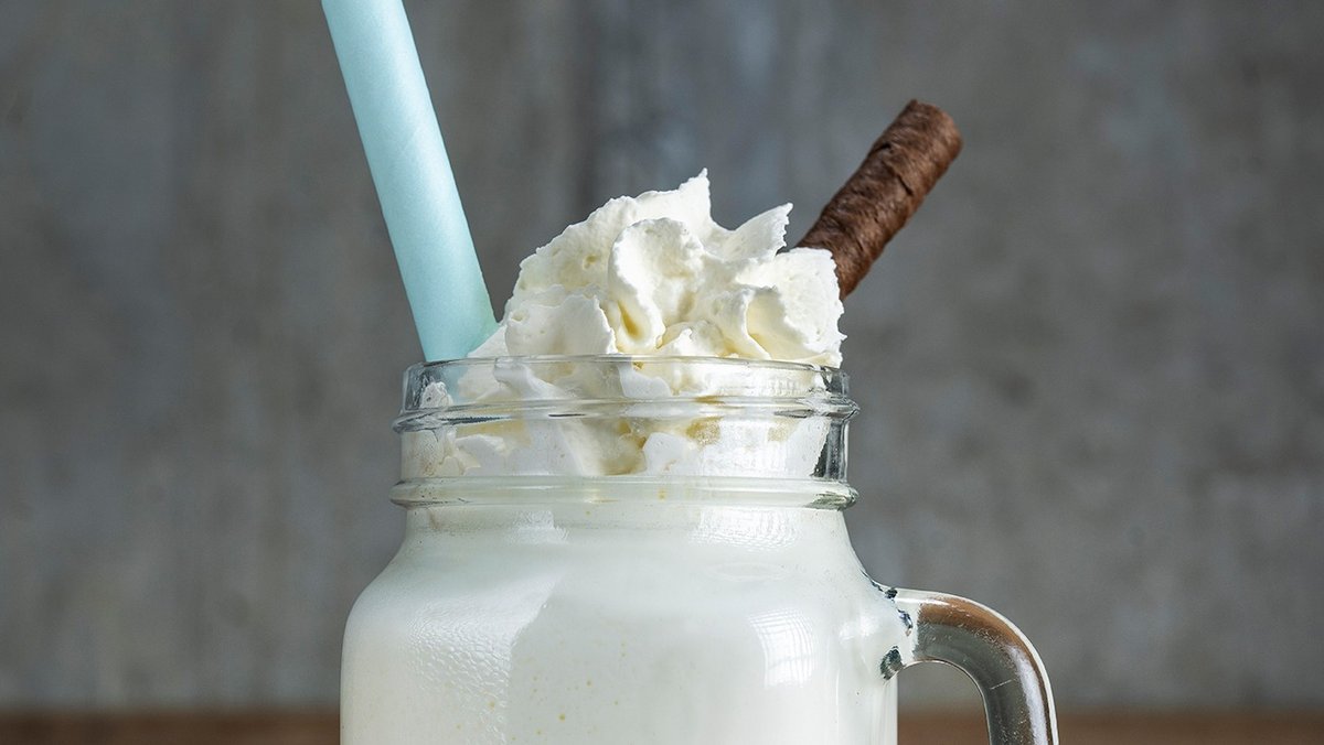 Vaniljeshake. Toppet med krem og sjokoladekjeks.