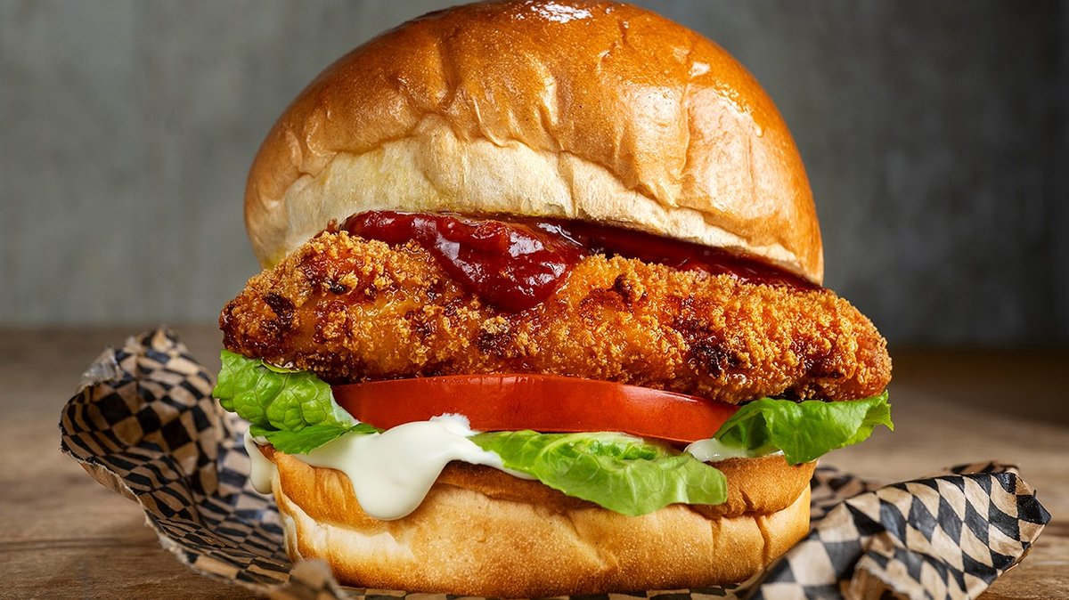 Kyllingburger med rømmedressing, salat, tomat, sterksaus og sprø kyllingfilet