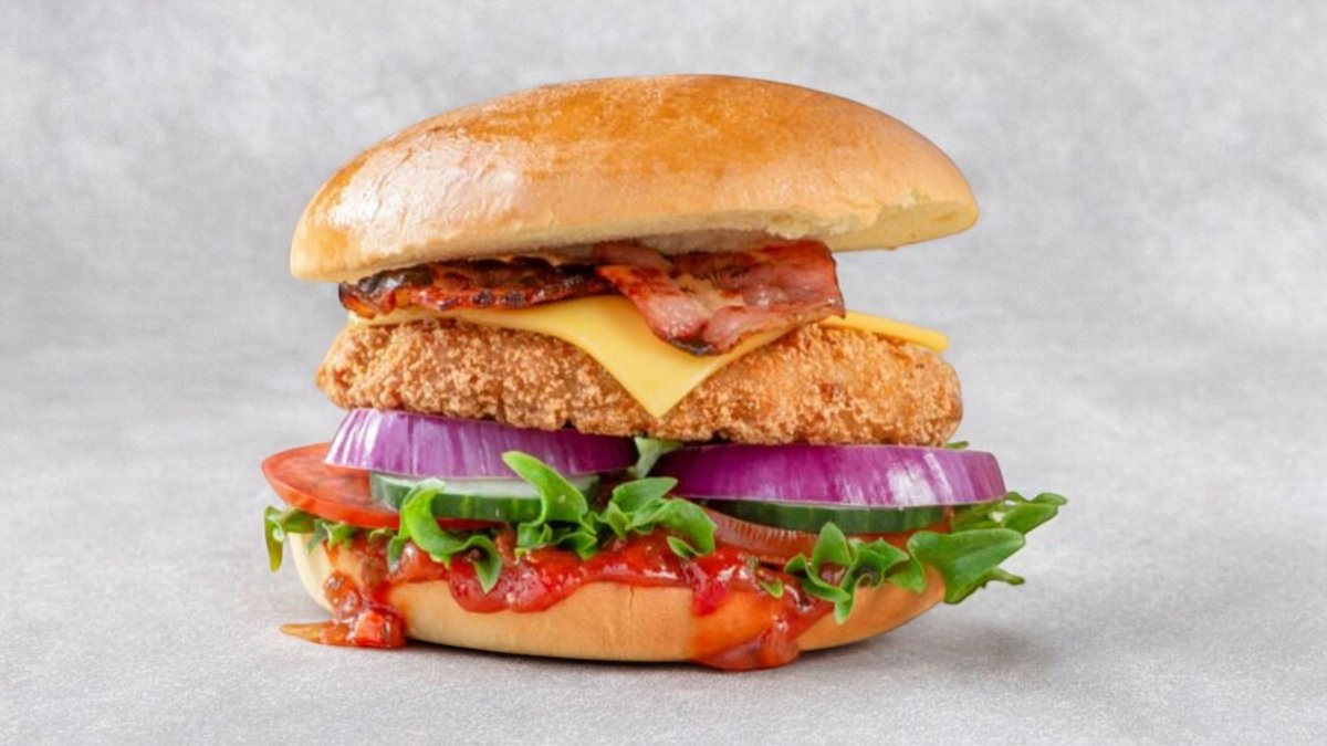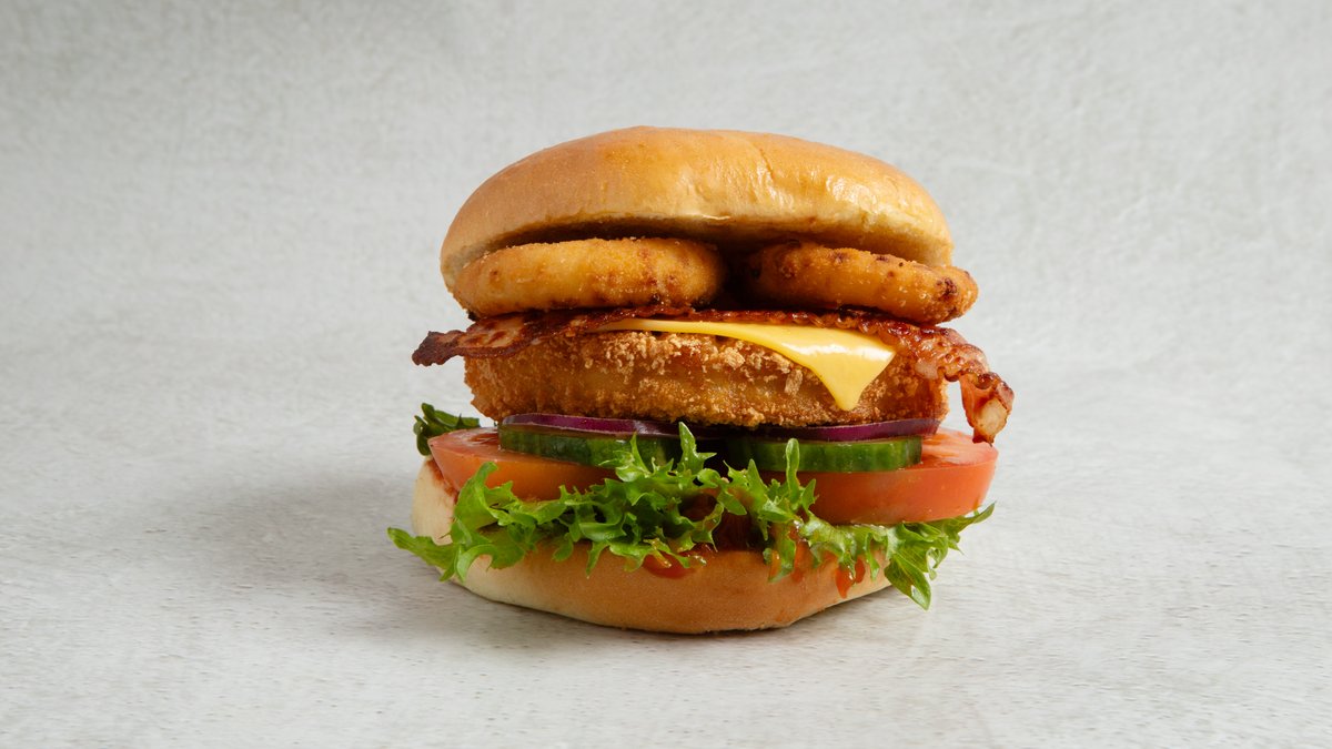 Juicy og sprø kyllingburger av kyllingfilet. Med barbequesaus, salat, tomat, agurk og rødløk. Toppet med deilig cheddarost, bacon. og friterte løkringer. Inkluderer 0,5 l drikke og medium fries.