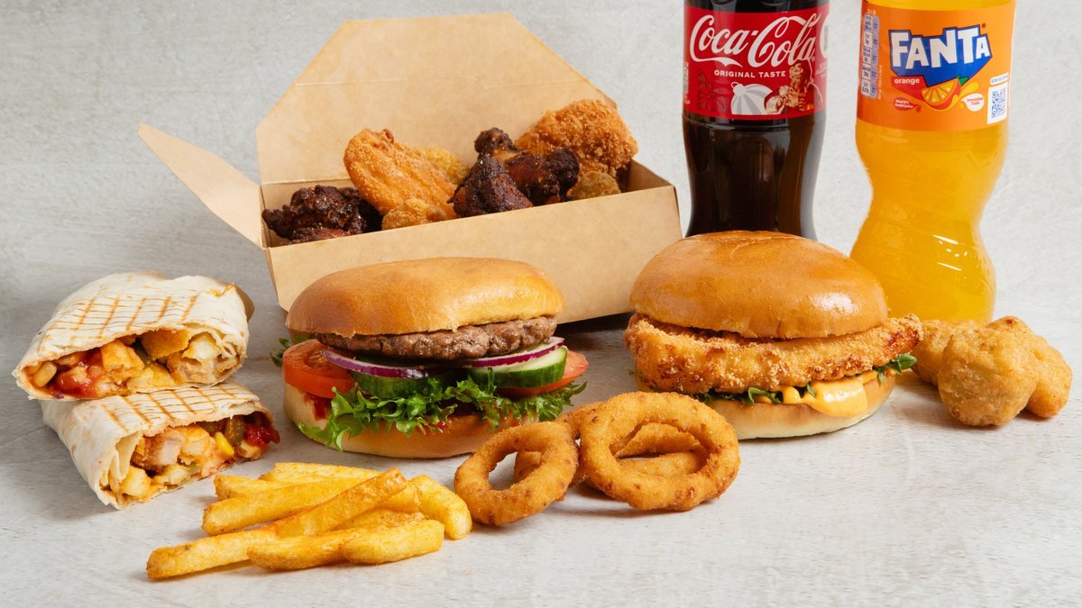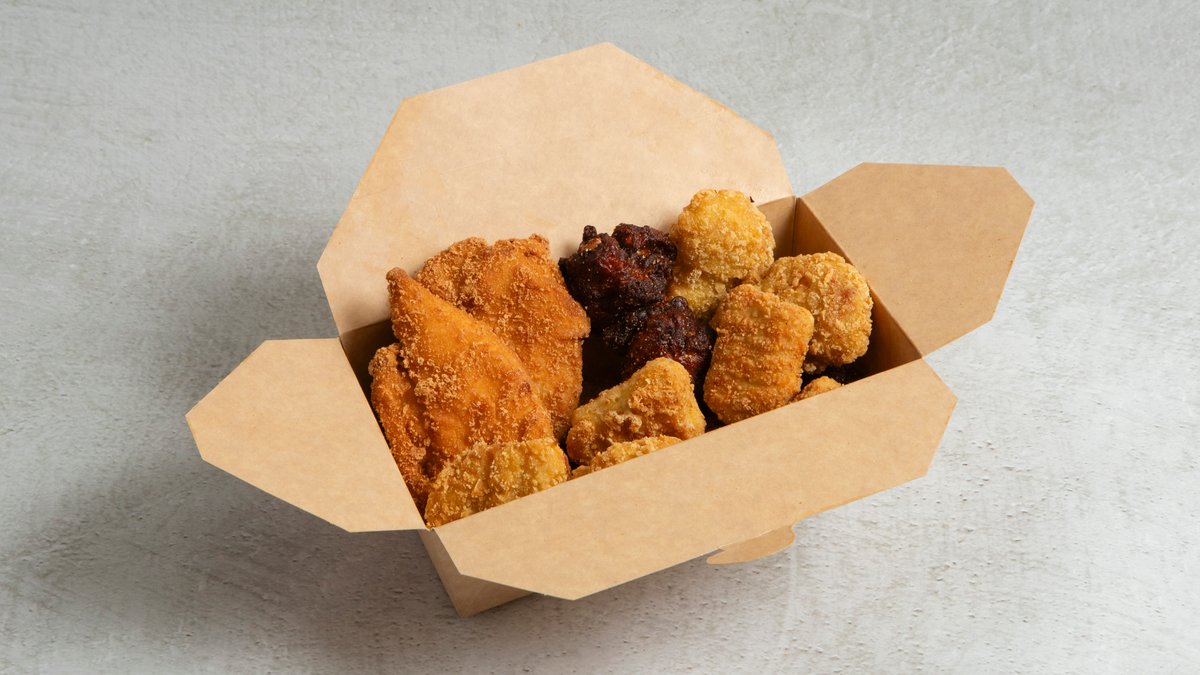 Utvalg av friterte kyllingbiter. 4x Nuggets 4x Buffalo Wings 4x Boneless leg Bites 2x Tenders. Inkluderer 0,5 l drikke og medium fries.