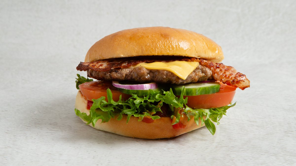 Juicy homestyle burger i briochebrød, med relish, salat, tomat, agurk og løk, toppet med deilig cheddaost og bacon. Inkluderer 0,5 l drikke og medium fries.