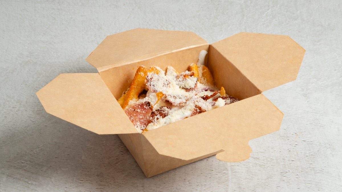 Sprø Fries med rød løk, jalapeños og garlicdressing. Toppet med deilig cheddarsaus og bacon.