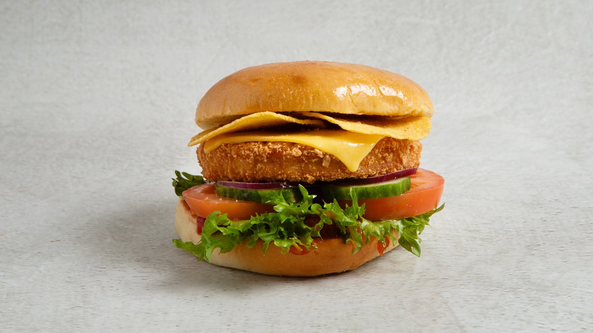 Juicy og sprø kylingburger av kyllingfilet. I briochebrød, med salsa, crispysalat, tomat, agurk og rødløk. Toppet med cheddarost og nachos. Inkluderer 0,5 l drikke og medium fries.