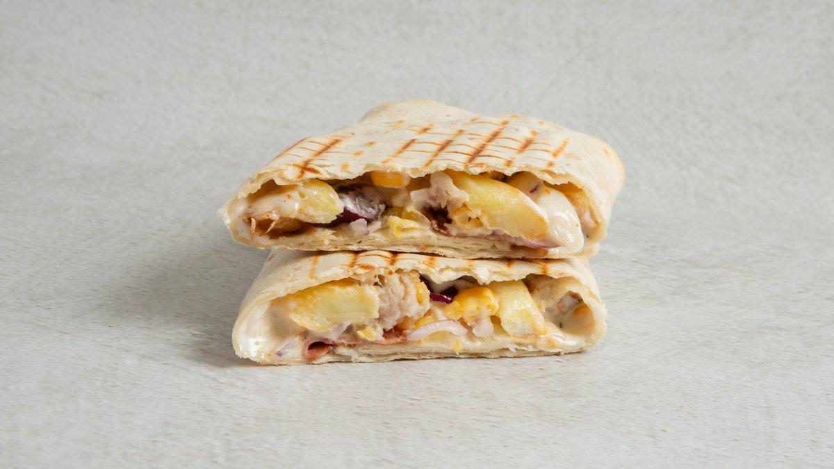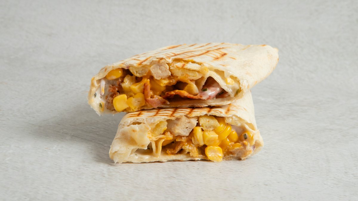 Toastet tortilla med sprø kylling. Fylt med hvitløksdressing, bacon, rødløk og mais. Toppet med smakfull revet parmesan.
