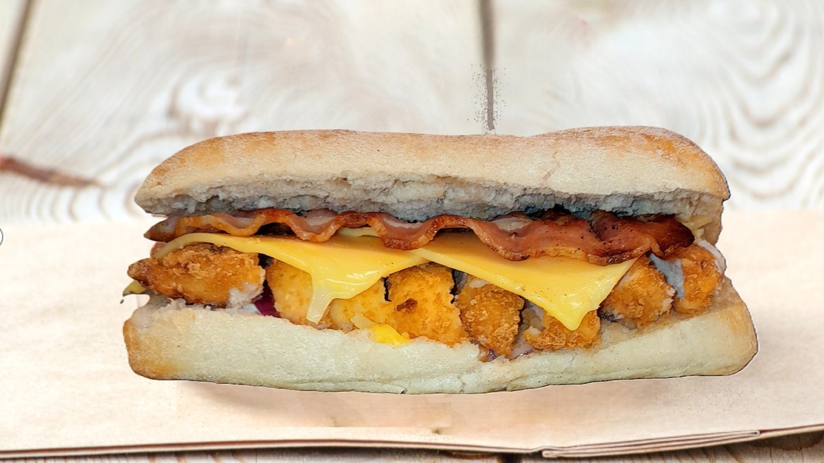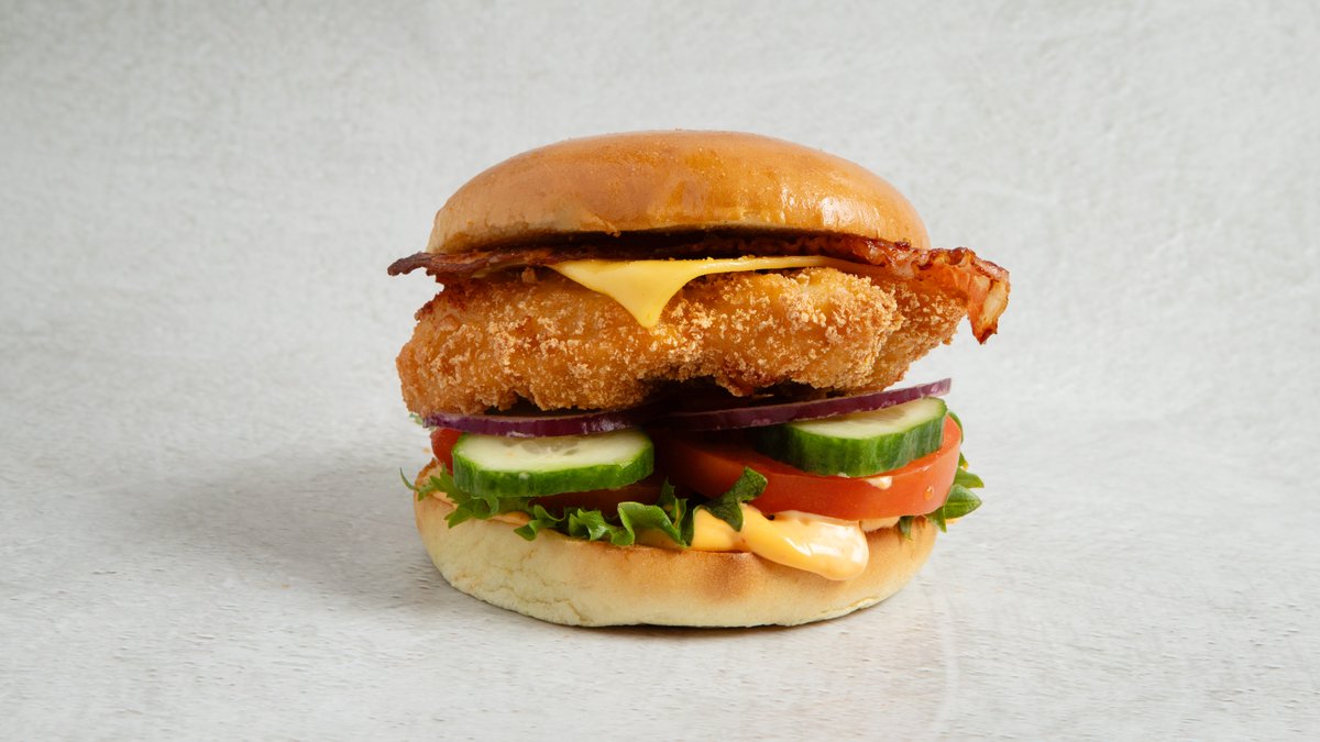 Crunchy og juicy hel kylling brystfilet i goumetbrø. Med spicy mayodressing, salat, tomat, agurk og rødløk. Toppet med Ost og Bacon. Inkluderer 0,5 l drikke og medium fries.