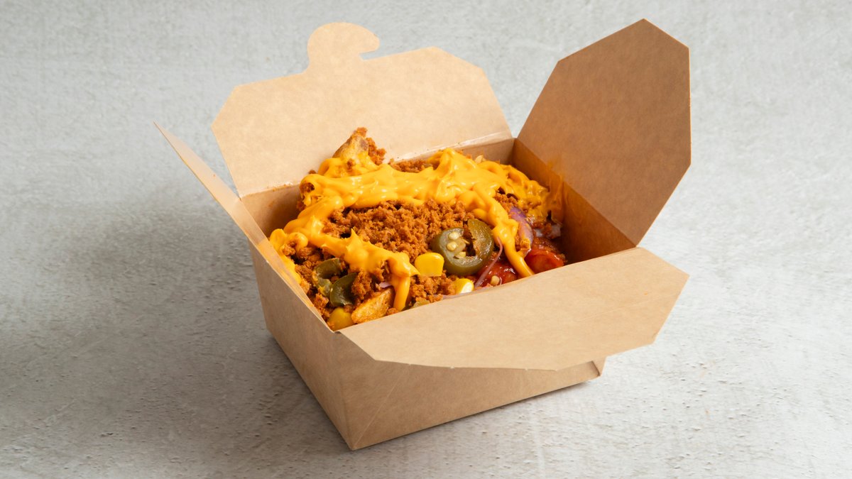Sprø Fries med tacokjøtt. Toppet med salsa, rød løk, mais, jalapeños, nachos og deilig cheddarsaus.
