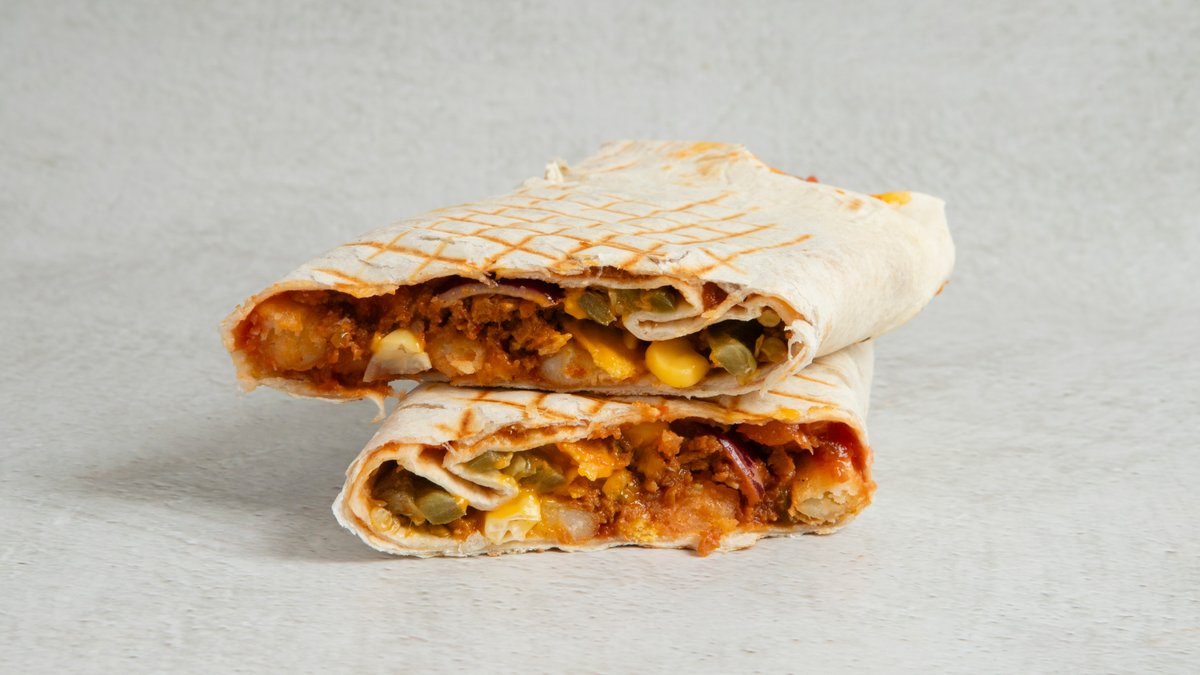 Toastet tortilla med slicet plantebasert burger. Fylt med salsa, rødløk, mais, jalapeños, nachos og ost.