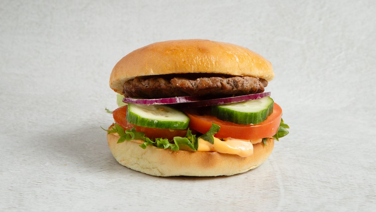 Sprø og saftig Plantebasert burger i briochebrød. Med relish, crispysalat, tomat, agurk og rødløk.
