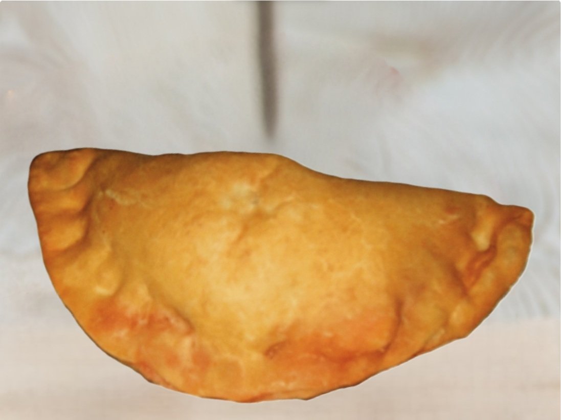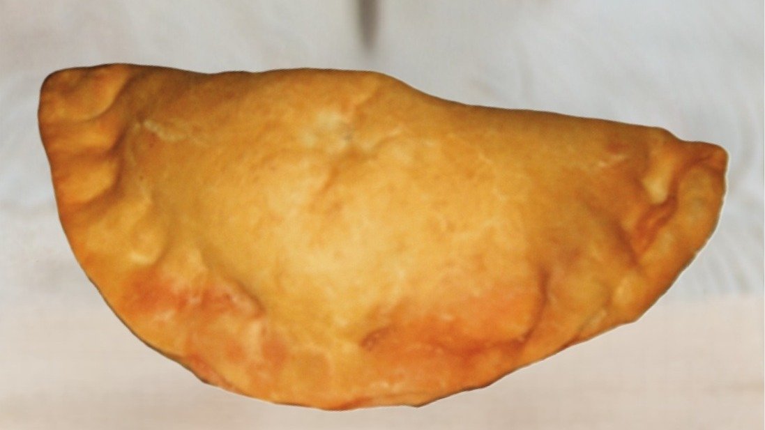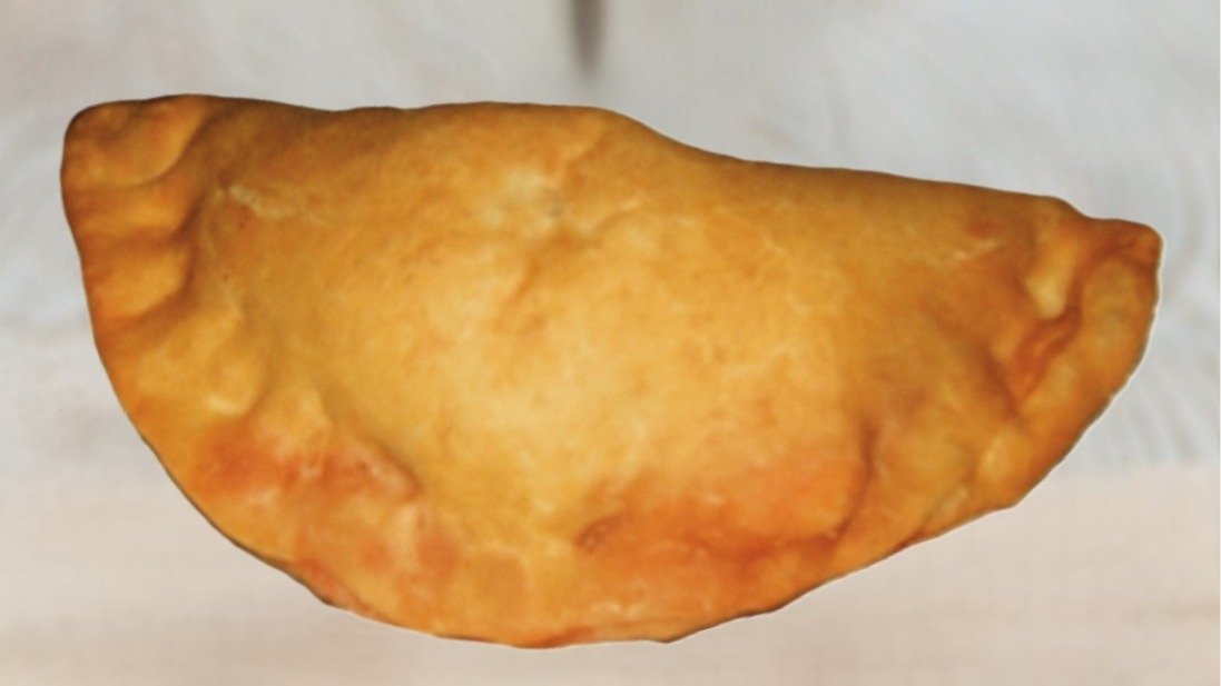 Fritert Calzone med pepperonipølse, paprika, rødløk, revet mozarella og pizzasaus,.