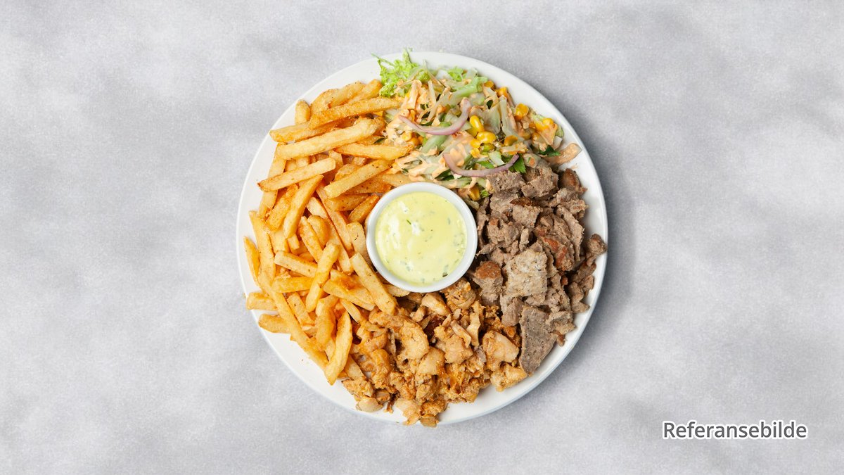 Tallerken med kebabkjøtt og marinert kyllingkjøtt servert med chips, salat og brød.