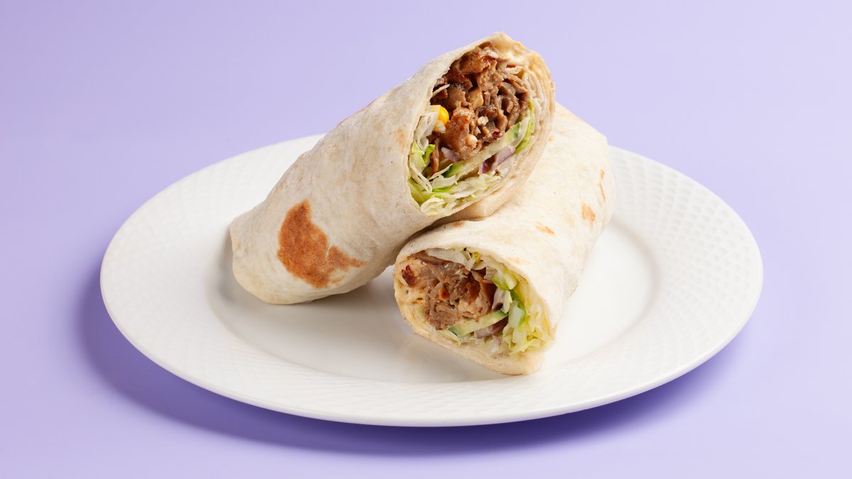 Kebabkjøtt med salat, rullet i hjemmelaget lefse.