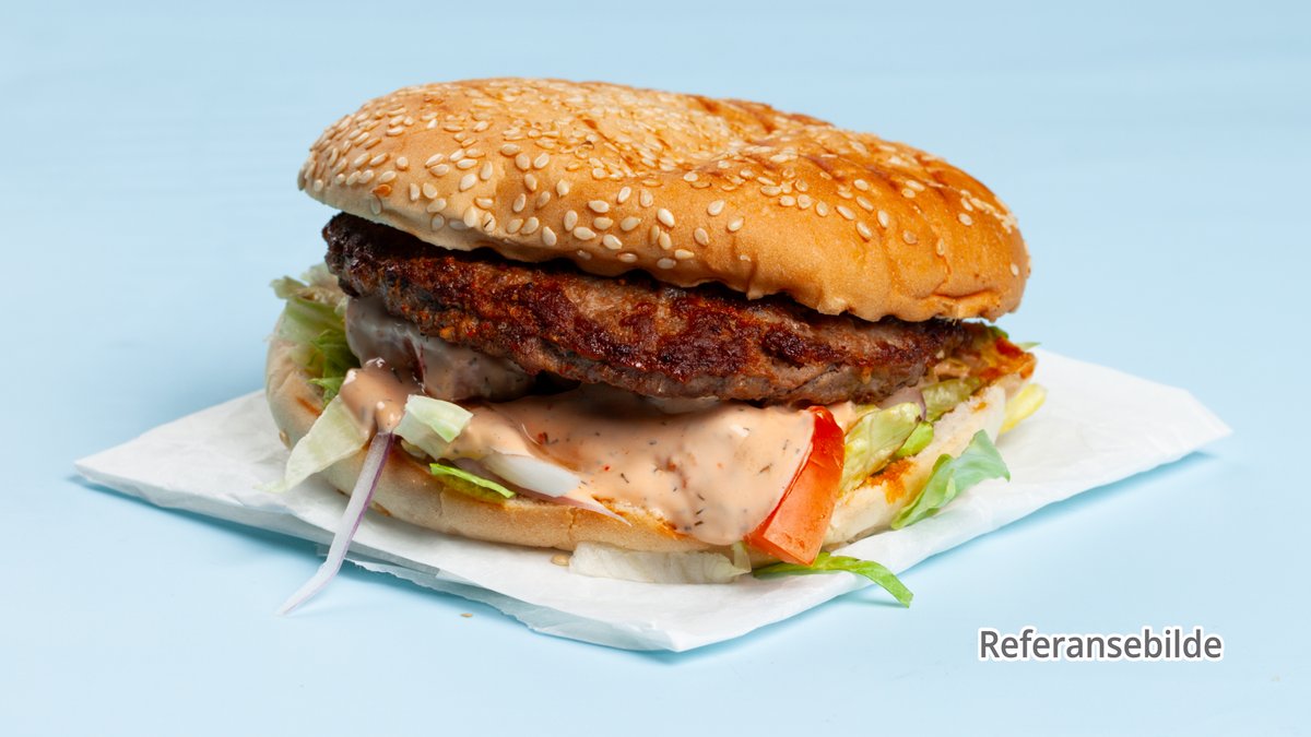 Burger med bacon, ost, salat, tomat, løk og dressing.