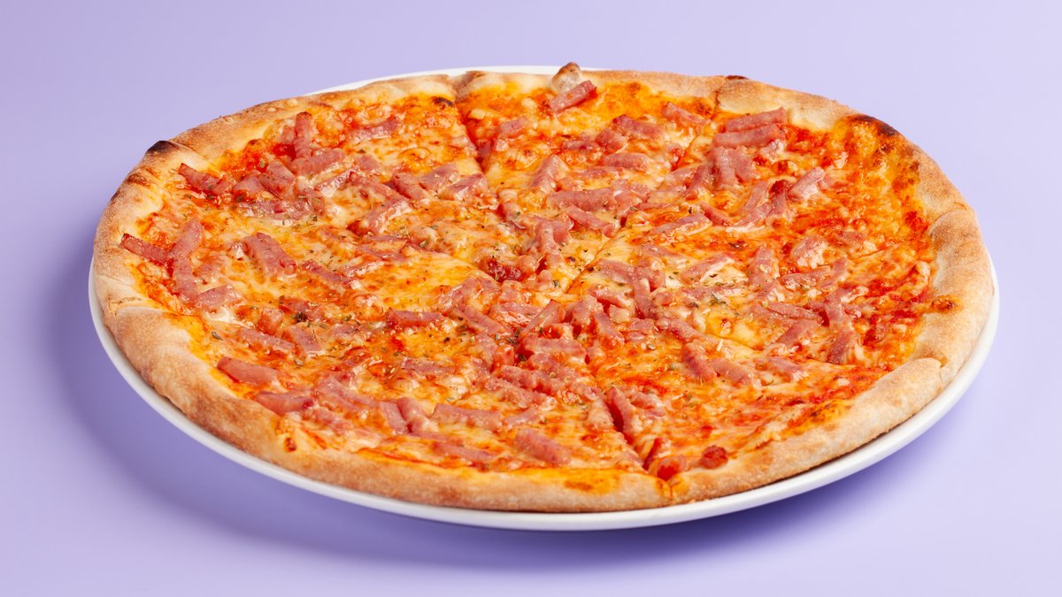 Innbakt pizza med tomatsaus, ost, skinke, kjøttdeig og løk.