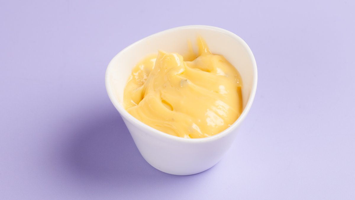 Innbakt pizza med tomatsaus, ost, biff, løk, sjampinjong og bearnaisesaus i beger.