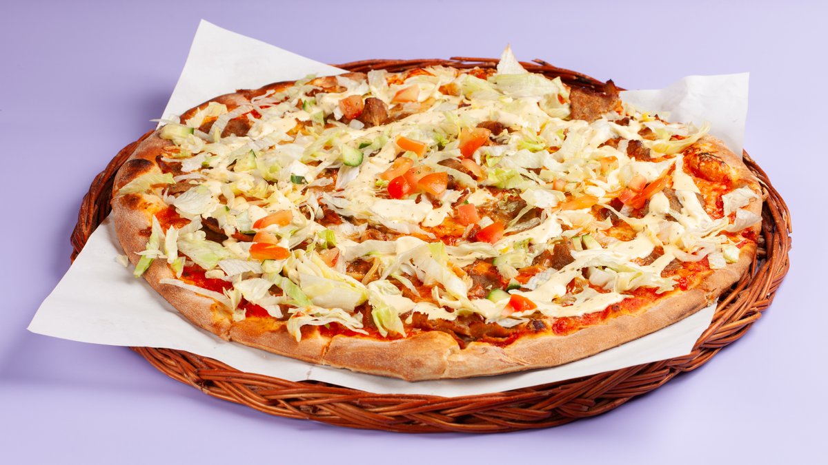 Innbakt pizza med tomatsaus, ost, döner, løk, tomat, agurk, salat og hvitløksaus.