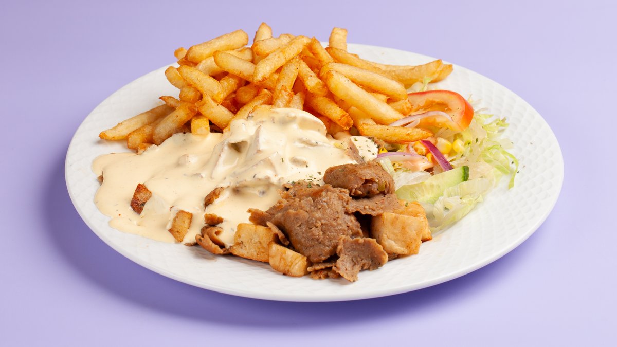 Dönerkjøtt, chips, ris og hvitløksdressing.