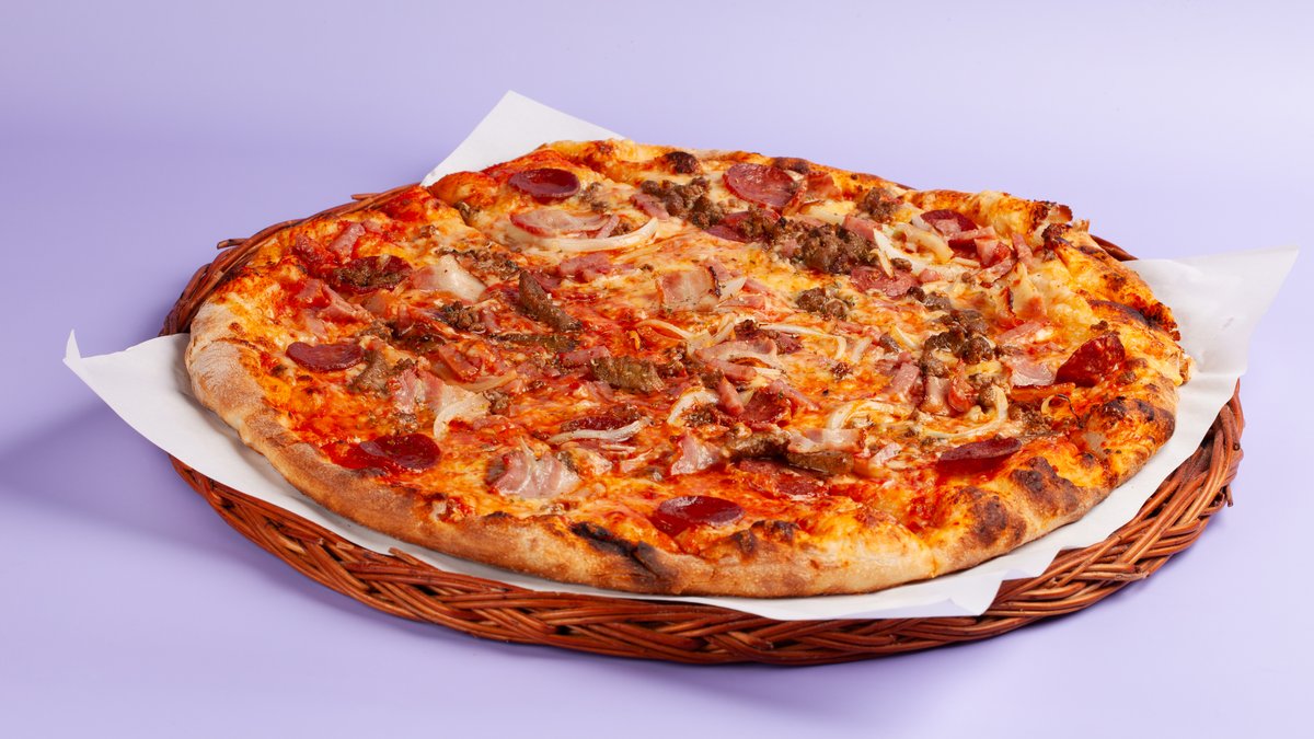 Tomatsaus, ost, biff, skinke, pepperoni, bacon, kjøttdeig og løk.