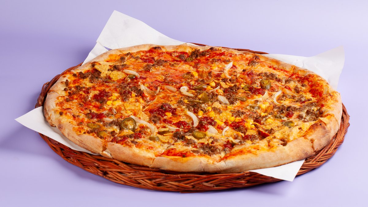 Innbakt pizza med tomatsaus, ost, biff, kjøttdeig, løk, sjampinjong, tacosaus og jalapeños.