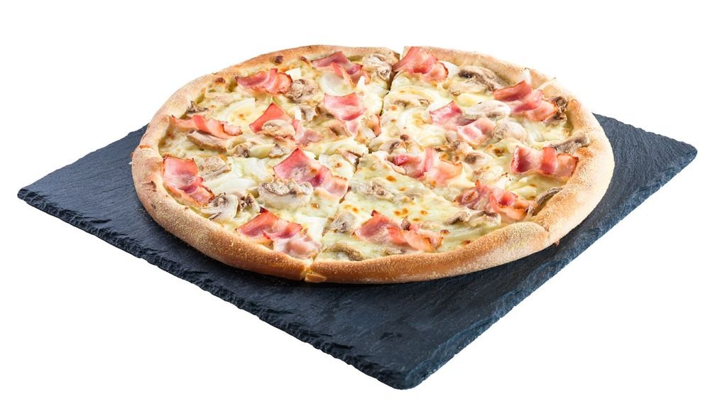 sos kremowy, mozzarella, boczek, pieczarki, cebula