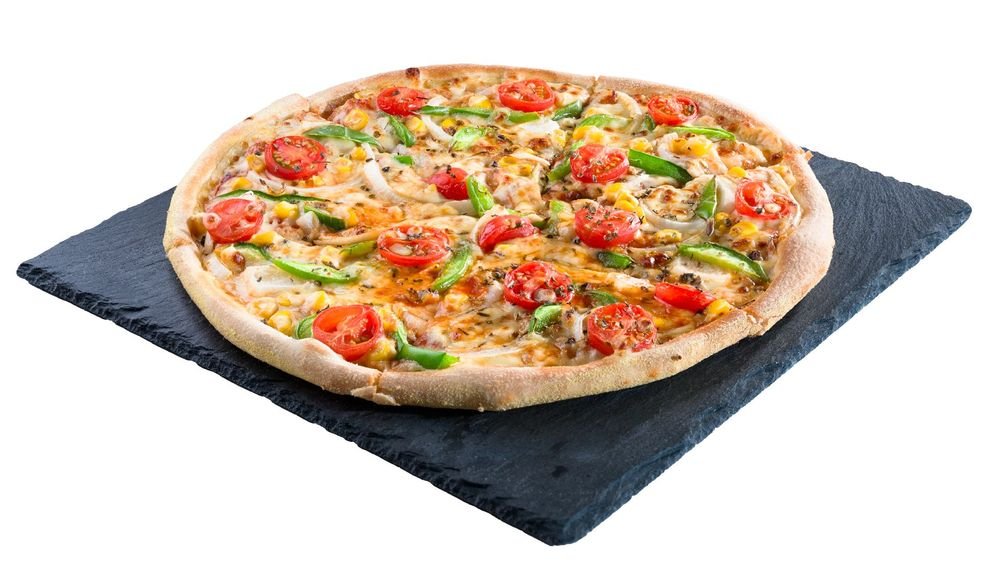 sos pomidorowy, mozzarella, kukurydza, pomidorki koktajlowe, papryka, cebula, oregano