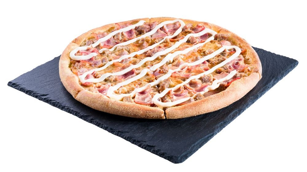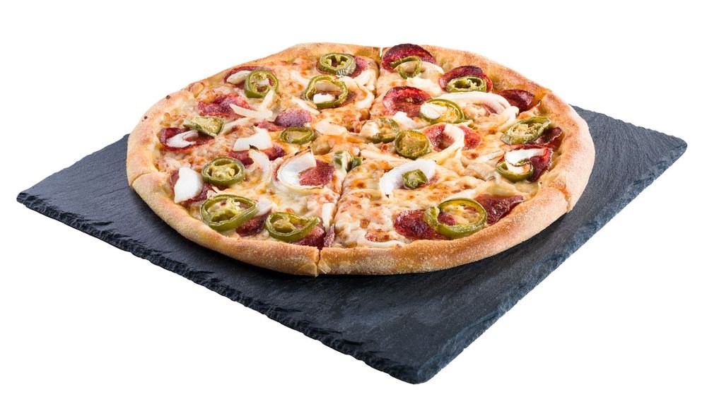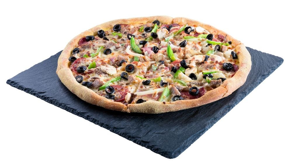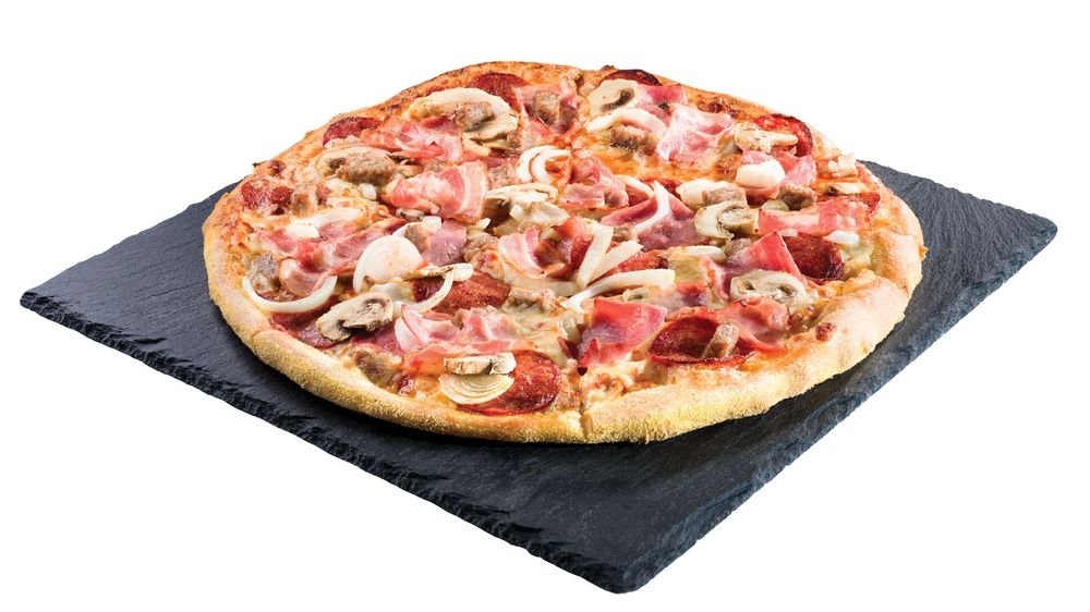 sos pomidorowy, podwójna mozzarella, kiełbasa pepperoni, szynka, cebula, papryka, pieczarki, wołowina, czarne oliwki