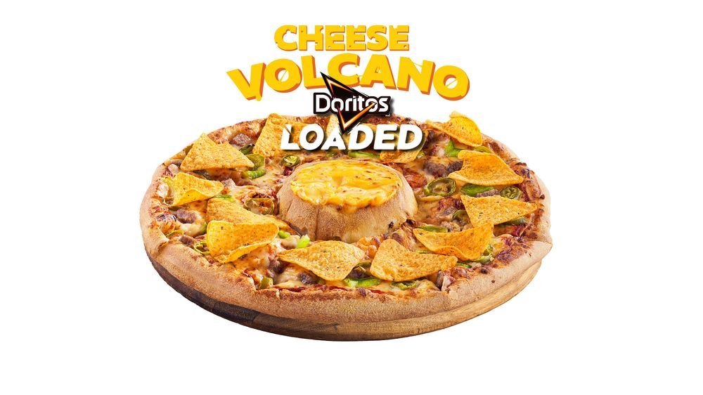 Pizza z kraterem pełnym gorącego, serowego sosu cheddar oraz sosem pomidorowym, serem mozzarella, wołowiną, papryką zieloną, papryczkami jalapeno i Doritos Sweet Chilli. Zawiera niezbędną do zachowania kształtu, niejadalną, aluminiową formę.