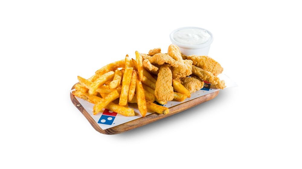 Zestaw panierowanych polędwiczek kurczaka z frytkami (370 g) i sosem czosnkowym (70 g)