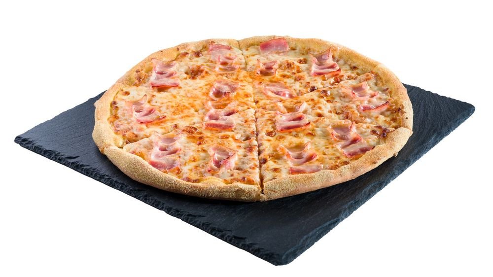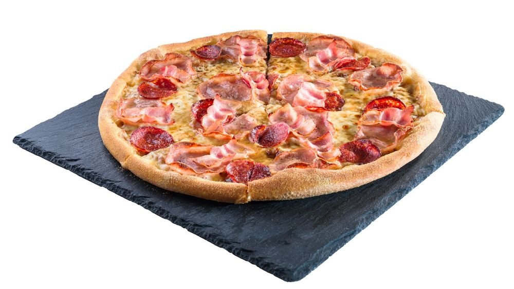 sos pomidorowy, mozzarella, kiełbasa pepperoni, szynka, boczek, pieczarki