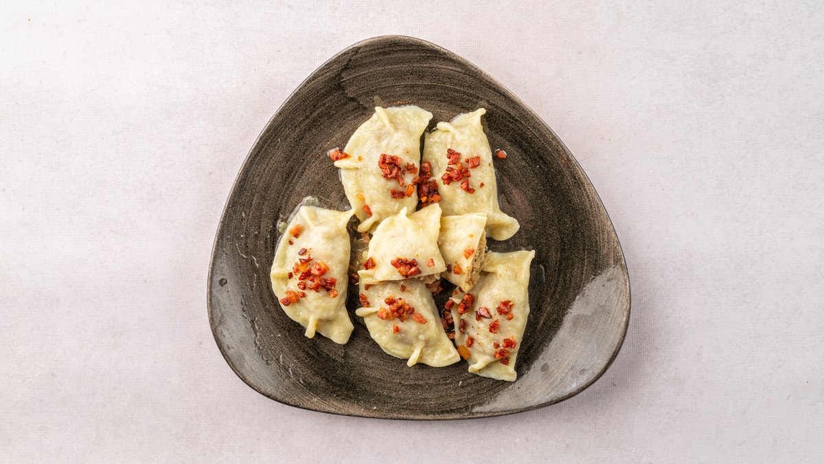 Pierogi chłopskie z ziemniakami, boczkiem, cebulą