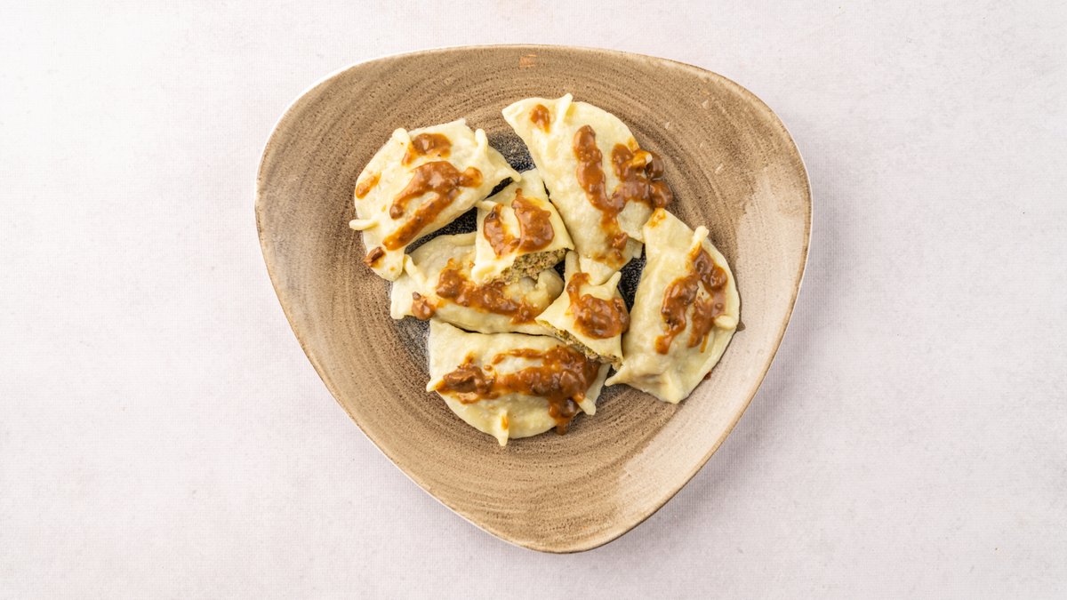 Pierogi ze szpinakiem, orzechami, polane sosem grzybowym