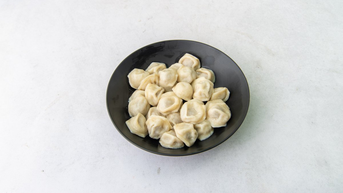 Pielmienie syberyjskie z mięsem wołowo-wieprzowym, podawane z kwaśną śmietaną